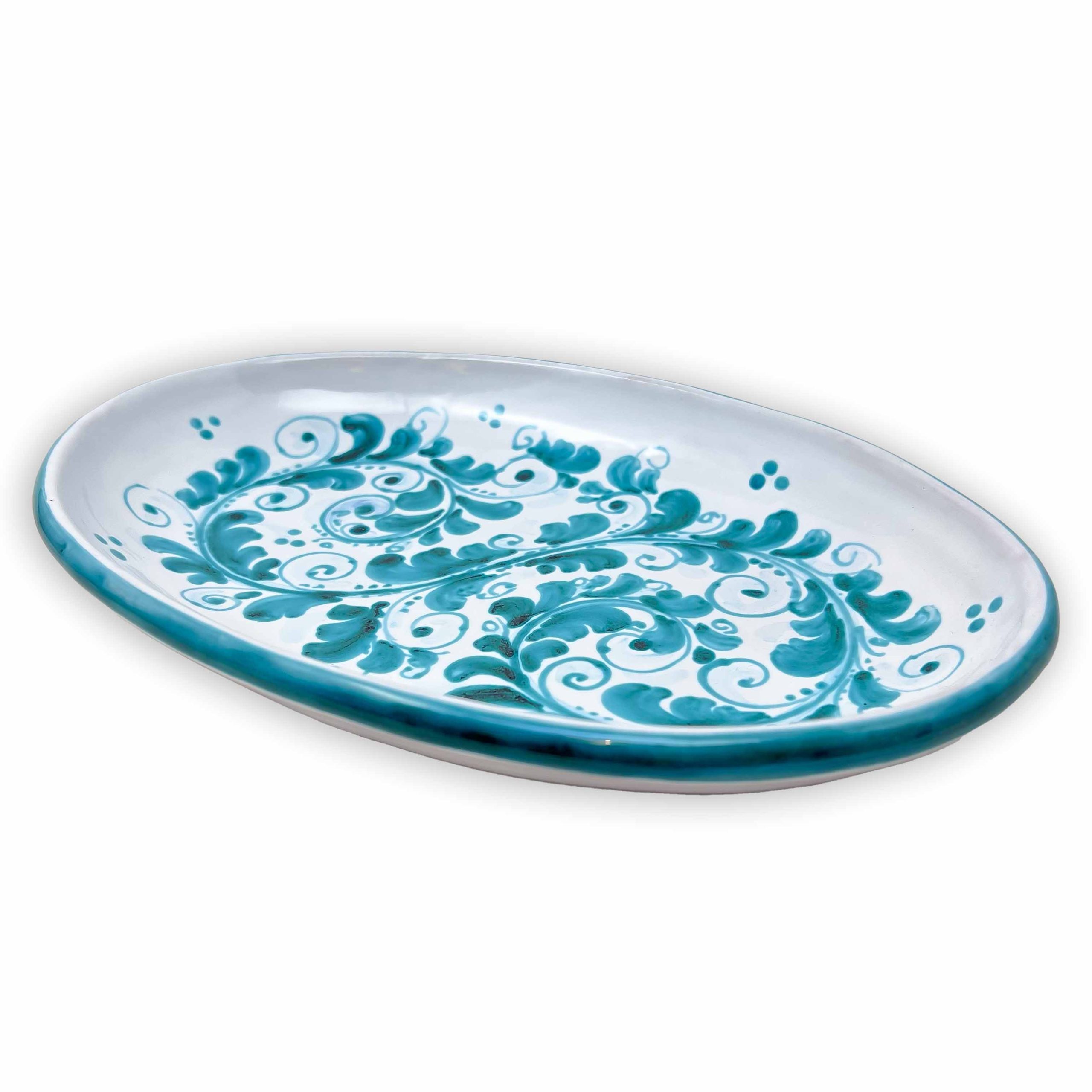 Bring a touch of Mediterranean charm to your table with this exquisite hand-painted ceramic Green long oval plate from Selinunte, a town renowned for its rich artistic heritage. Signed Best Sicily, this long oval plate showcases intricate Blue maiolica patterns, meticulously painted by skilled artisans.