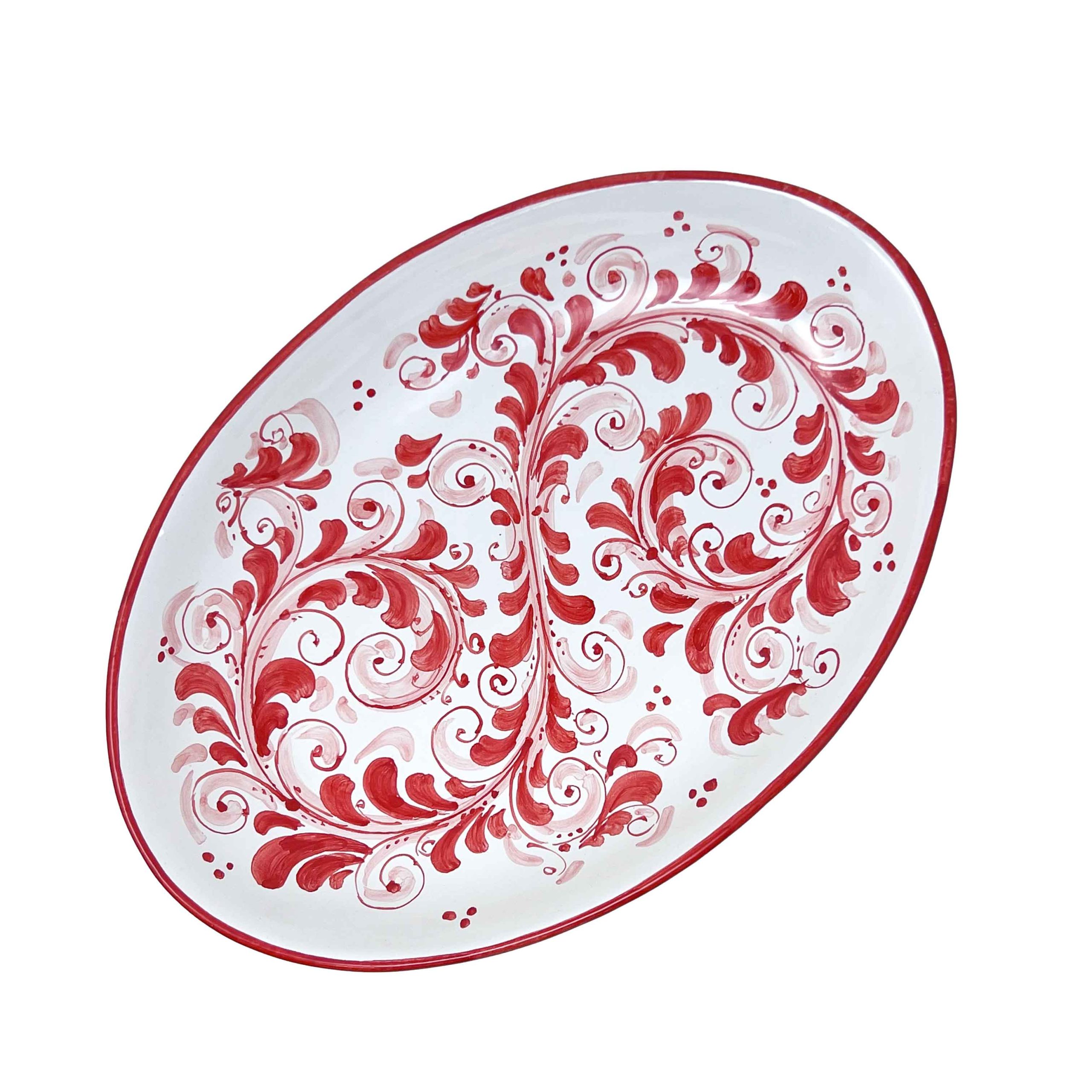 Bring a touch of Mediterranean charm to your table with this exquisite hand-painted ceramic red long oval plate from Selinunte, a town renowned for its rich artistic heritage. Signed Best Sicily, this long oval plate showcases intricate red maiolica patterns, meticulously painted by skilled artisans.