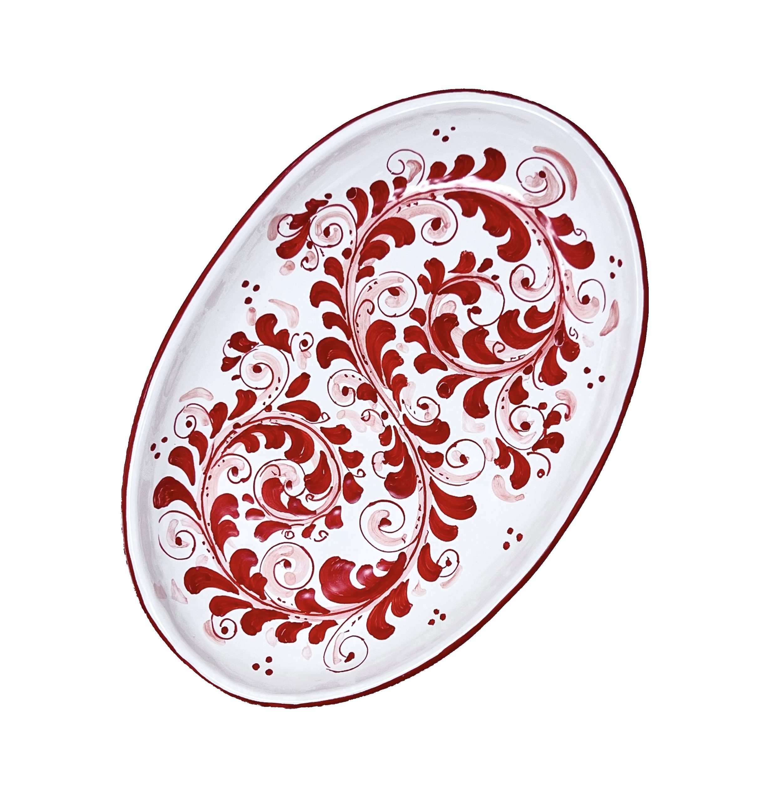 Bring a touch of Mediterranean charm to your table with this exquisite hand-painted ceramic red long oval plate from Selinunte, a town renowned for its rich artistic heritage. Signed Best Sicily, this long oval plate showcases intricate red maiolica patterns, meticulously painted by skilled artisans.