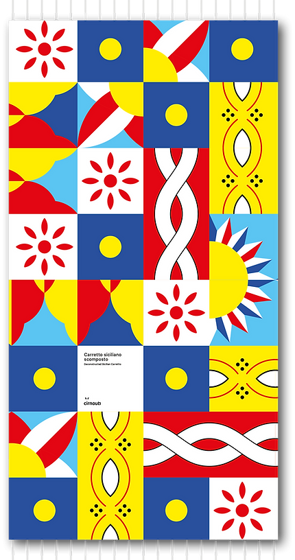 The design bursts with life, featuring bold reds, rich yellows, and deep blues, reminiscent of the colorful carts that have symbolized Sicilian culture for centuries.