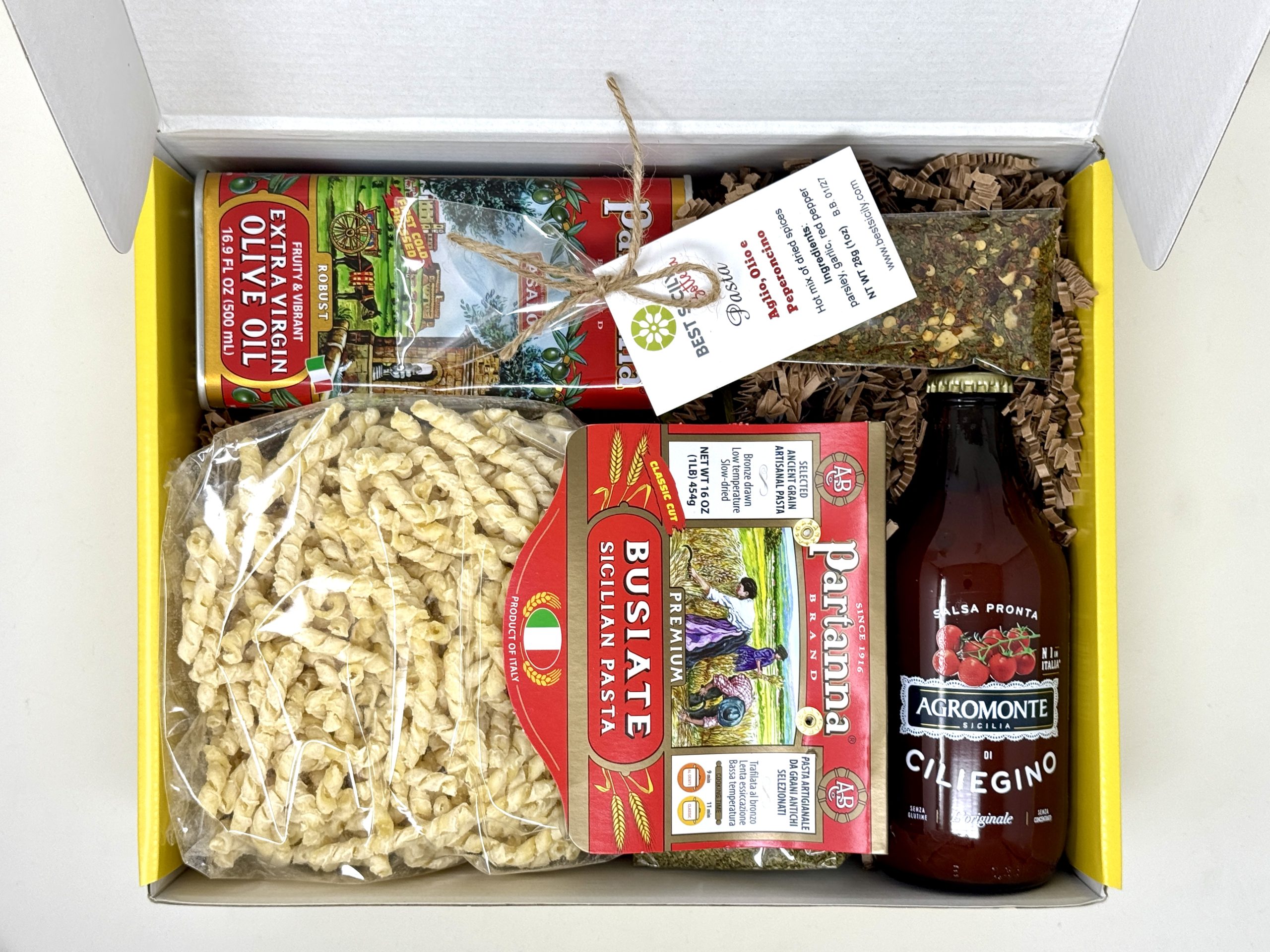 A curated selection of Italian essentials for an authentic pasta dinner at home. Featuring premium busiate pasta, organic tomato sauce, extra virgin olive oil, a Aglio, Olio & Peperoncino seasoning, and fragrant dried oregano.
