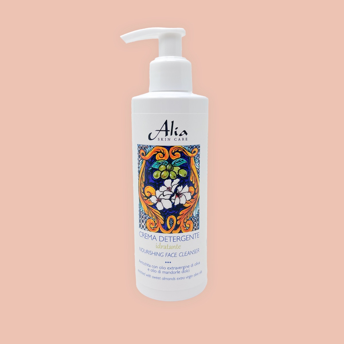 Moisturising and Alia, Nourishing Face Cleanser cream made with extra virgin olive oil, sweet almond oil and the extract of marigold, to cleanse the face gently, maintaining moisturisation and softness.