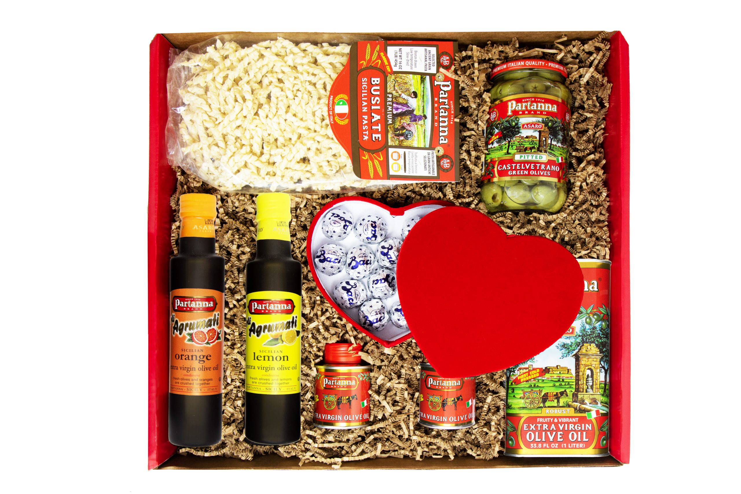 The box includes Baci Perugina chocolates in a luxurious velvet heart-shaped box. It also includes pasta and lemon and orange olive oils.